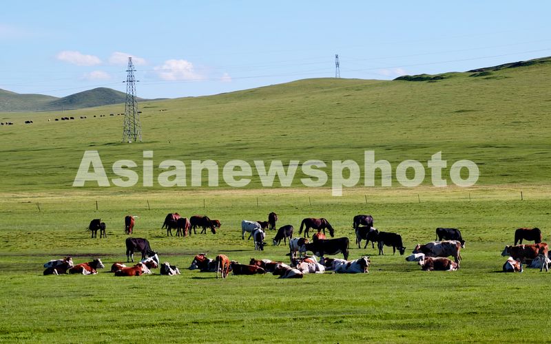 图片说明:2025年8月9日,内蒙古呼伦贝尔大草原一望无际,成群的牛马羊在草原上享受着美味的青草。