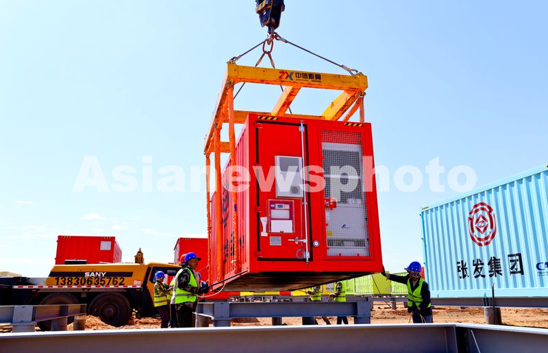 图片说明:2025年8月12日,甘肃省张掖市临泽县北部滩新能源产业园内,工程建设者们正在抢抓天气晴好时机进300MW/1200MWh独立共享储能电站的储能电池集装仓吊装。