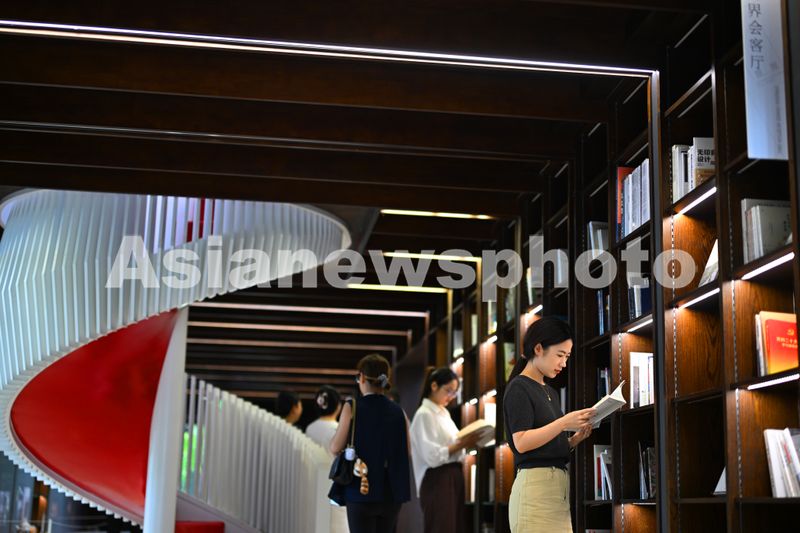 图片说明:8月13日,游客在白鹭湾景区可可饮品图书馆内翻阅图书。