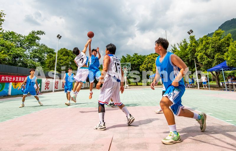 2025年8月12日,贵州省从江县刚边壮族乡,参赛球员在进行篮球比赛。