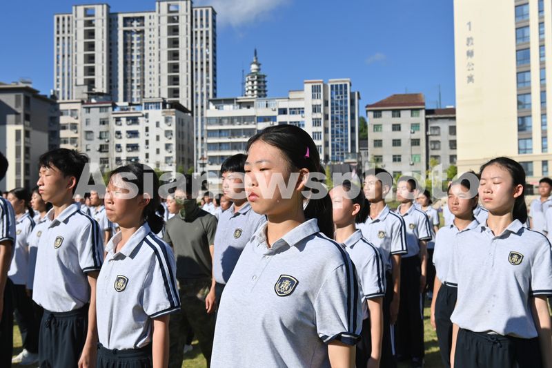 图片说明:8月15日,浙江省东阳市中天高级中学的高一新生在参加军训。
