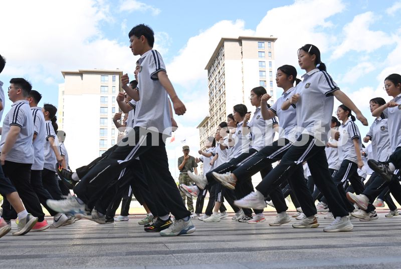 图片说明:8月15日,浙江省东阳市中天高级中学的高一新生在参加军训。