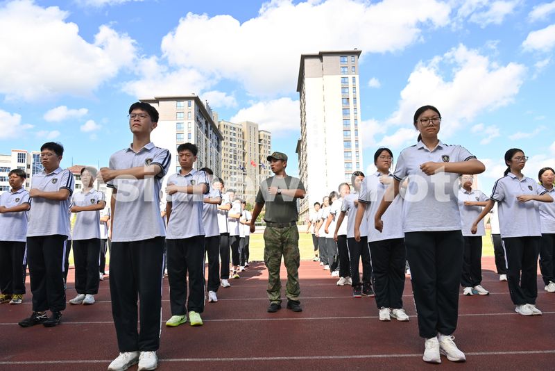 图片说明:8月15日,浙江省东阳市中天高级中学的高一新生在参加军训。