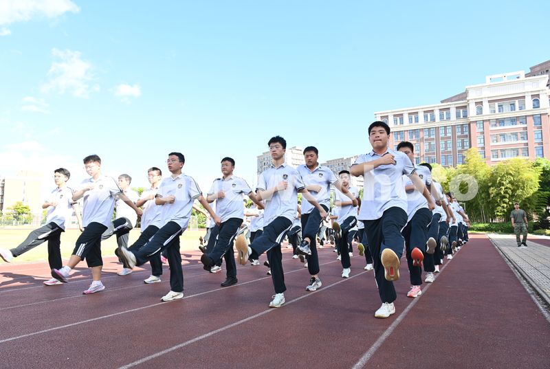 图片说明:8月15日,浙江省东阳市中天高级中学的高一新生在参加军训。