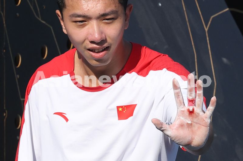 中国选手富思达赛后展示受伤的手掌。
