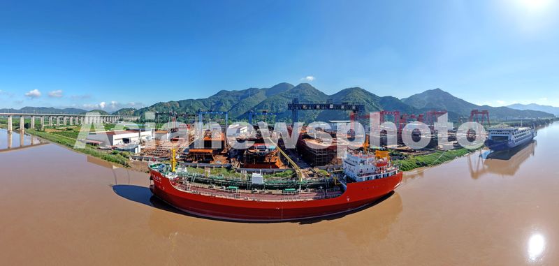2025年8月19日,浙江省临海市涌泉镇一家船业有限公司,工人们正在修造各类大型船舶。