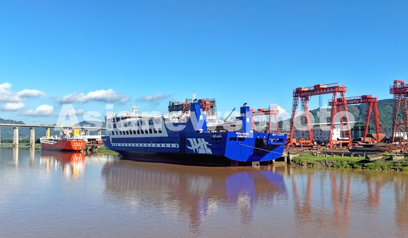 2025年8月19日,浙江省临海市涌泉镇一家船业有限公司,工人们正在修造各类大型船舶。