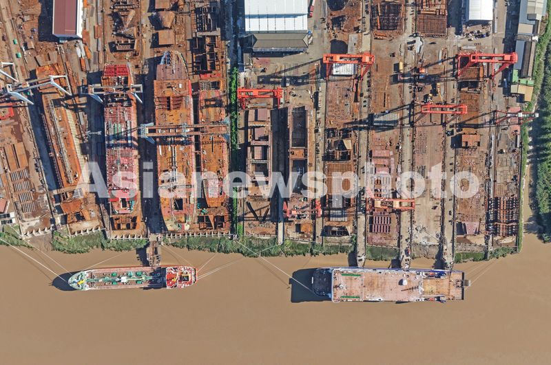 2025年8月19日,浙江省临海市涌泉镇一家船业有限公司,工人们正在修造各类大型船舶。