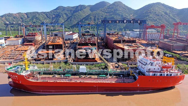 2025年8月19日,浙江省临海市涌泉镇一家船业有限公司,工人们正在修造各类大型船舶。