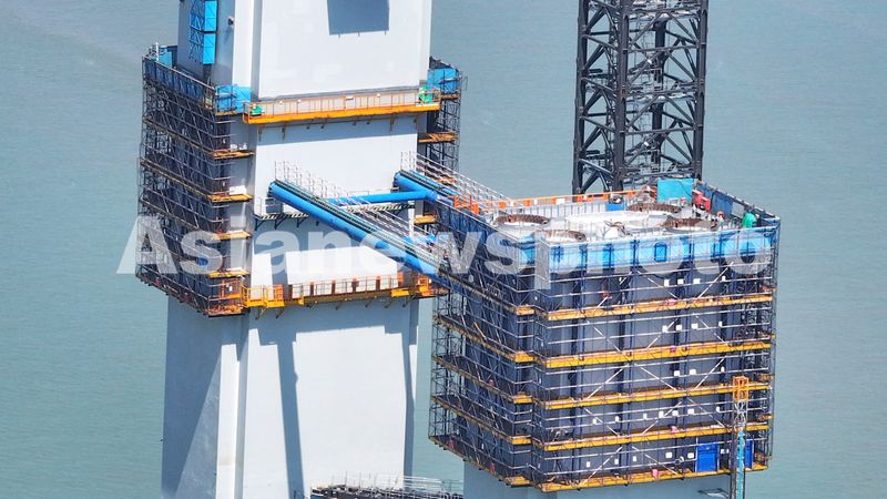 图片说明:2025年8月19日,江苏省张家港市,张靖皋长江大桥南航道桥建设现场,工人们正在有序进行施工作业。