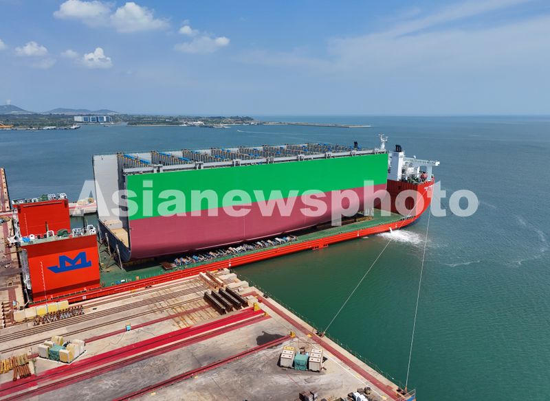 图片说明:2025年8月21日,在山东烟台黄渤海新区一家造船企业,半潜船准备将大型集装箱船船体分段运往总装基地。
