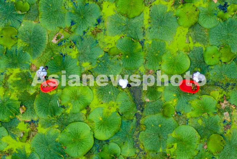 2025年8月22日,农民在江苏省靖江市东兴镇惠圣村采收芡实(无人机照片)。