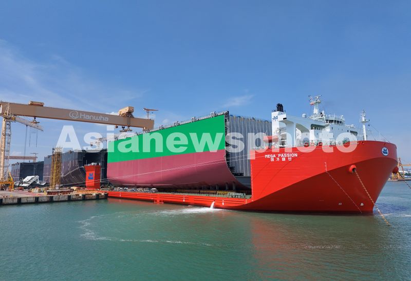 图片说明:2025年8月21日,在山东烟台黄渤海新区一家造船企业,半潜船准备将大型集装箱船船体分段运往总装基地。