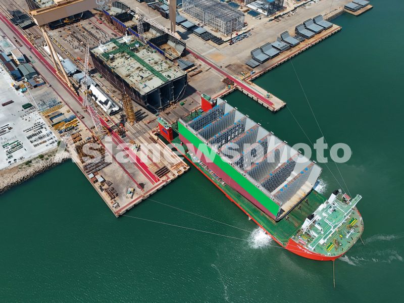图片说明:2025年8月21日,在山东烟台黄渤海新区一家造船企业,半潜船准备将大型集装箱船船体分段运往总装基地。
