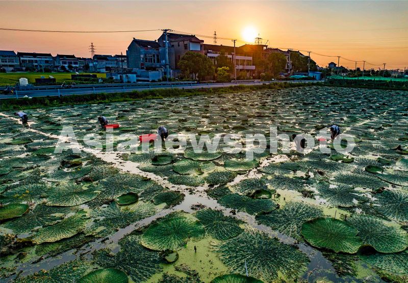 2025年8月22日,农民在江苏省靖江市东兴镇惠圣村采收芡实(无人机照片)。
