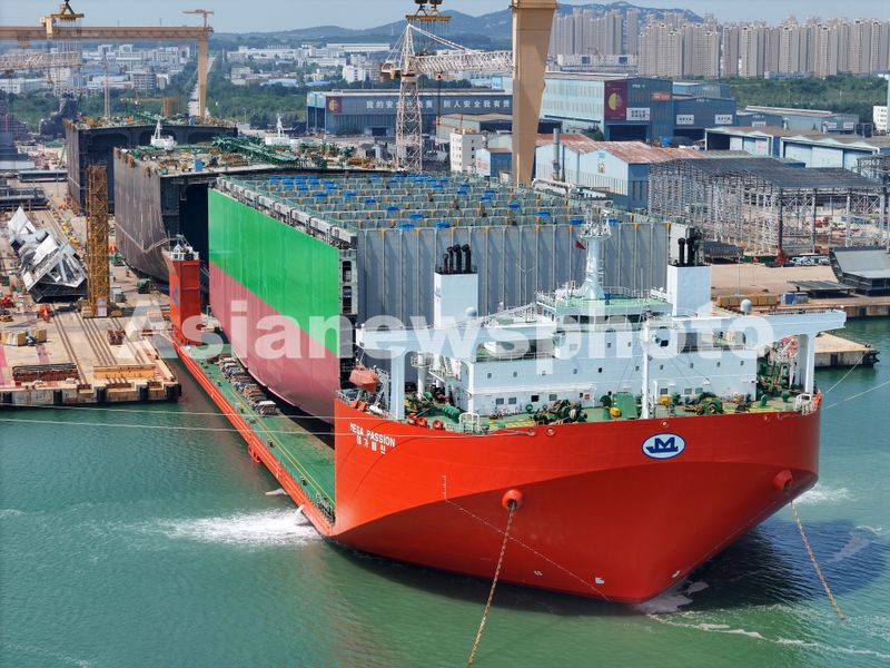 图片说明:2025年8月21日,在山东烟台黄渤海新区一家造船企业,半潜船准备将大型集装箱船船体分段运往总装基地。