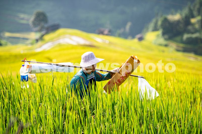 2025年8月24日,村民走在贵州省从江县加榜梯田里去抢收水稻。