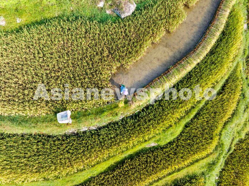 2025年8月24日,村民在贵州省从江县加榜梯田里抢收水稻(无人机照片)。