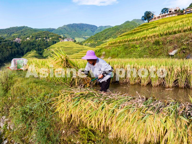 2025年8月24日,初秋时节,贵州省黔东南苗族侗族自治州从江县加榜梯田水稻陆续成熟,当地村民抢抓农时收割,层层梯田与苗寨、青山交相辉映,勾勒出一幅美丽的丰收画卷。