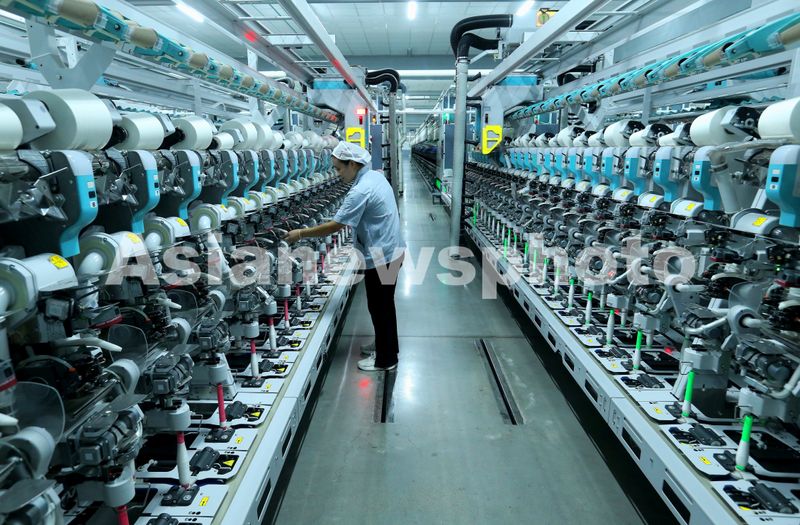 图片说明:2025年8月27日,工人在位于山东省青岛市即墨区龙山街道的一家纺织科技有限公司智慧纺纱生产线上生产高端纤维。
