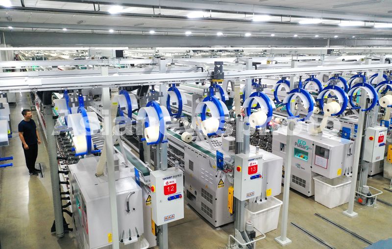 图片说明:2025年8月27日,工人在位于山东省青岛市即墨区龙山街道的一家纺织科技有限公司智慧纺纱生产线上生产高端纤维。