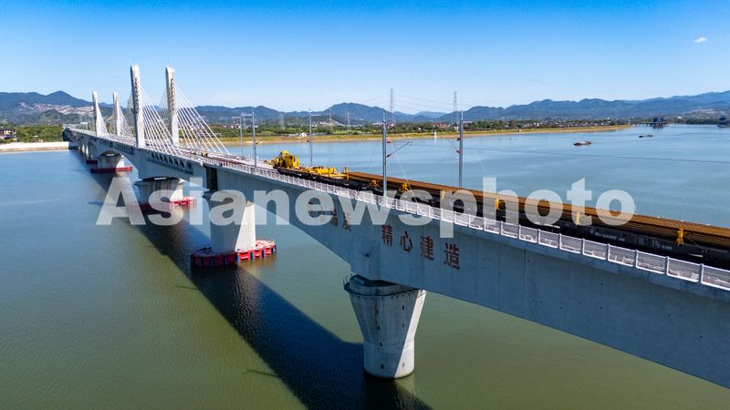 图片说明:2025年8月28日,俯瞰浙江省金华市金建高铁兰江特大桥桥面上,工程列车在忙于运输材料,轨道铺设工作正有序进行(无人机照片)。