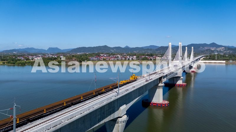 图片说明:2025年8月28日,俯瞰浙江省金华市金建高铁兰江特大桥桥面上,工程列车在忙于运输材料,轨道铺设工作正有序进行(无人机照片)。