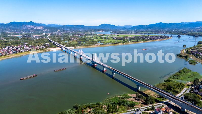 图片说明:2025年8月28日,俯瞰浙江省金华市金建高铁兰江特大桥桥面上,工程列车在忙于运输材料,轨道铺设工作正有序进行(无人机照片)。
