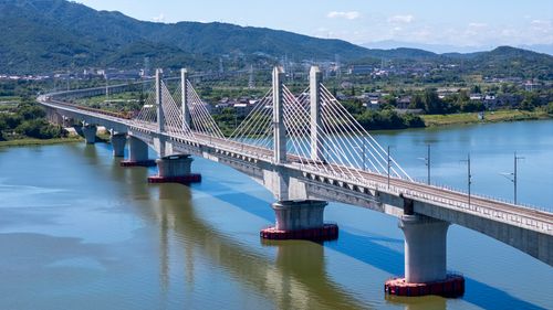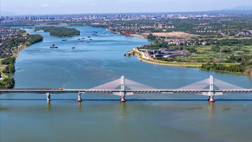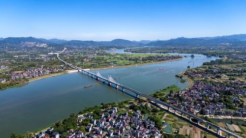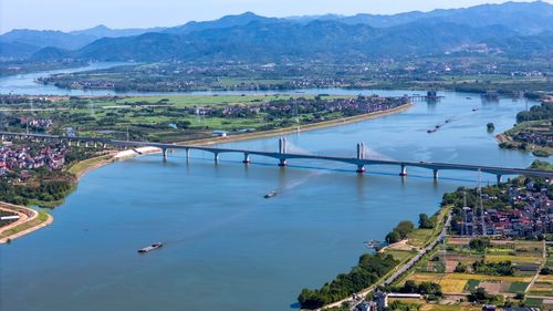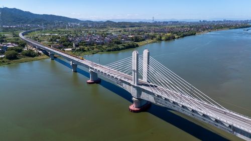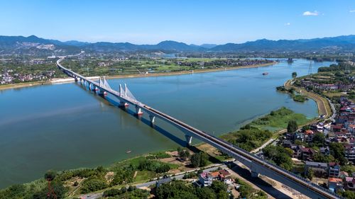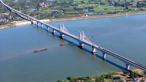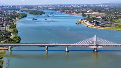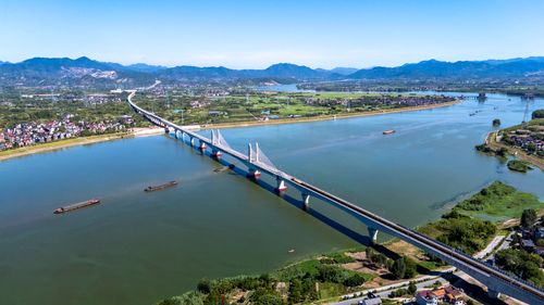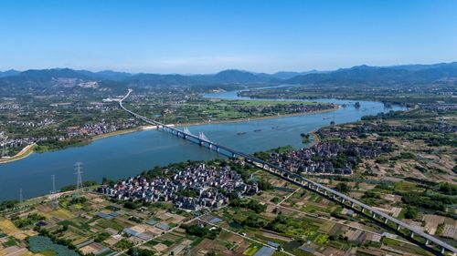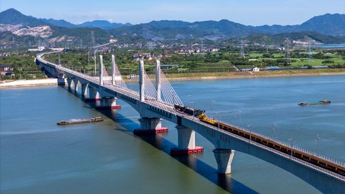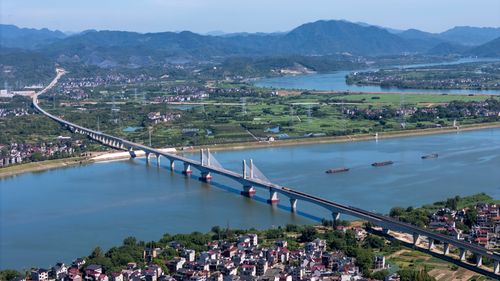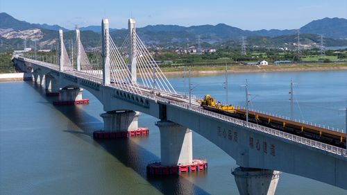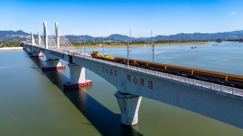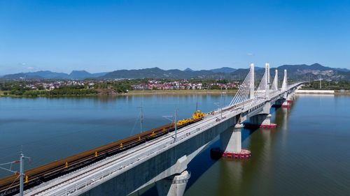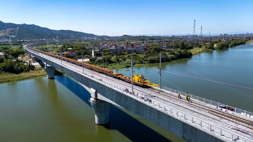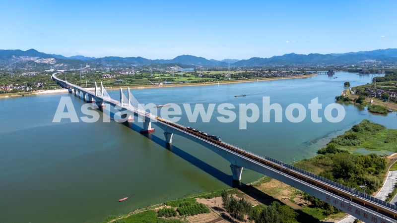 图片说明:2025年8月28日,俯瞰浙江省金华市金建高铁兰江特大桥桥面上,工程列车在忙于运输材料,轨道铺设工作正有序进行(无人机照片)。