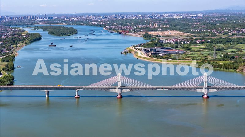 图片说明:2025年8月28日,俯瞰浙江省金华市金建高铁兰江特大桥桥面上,工程列车在忙于运输材料,轨道铺设工作正有序进行(无人机照片)。