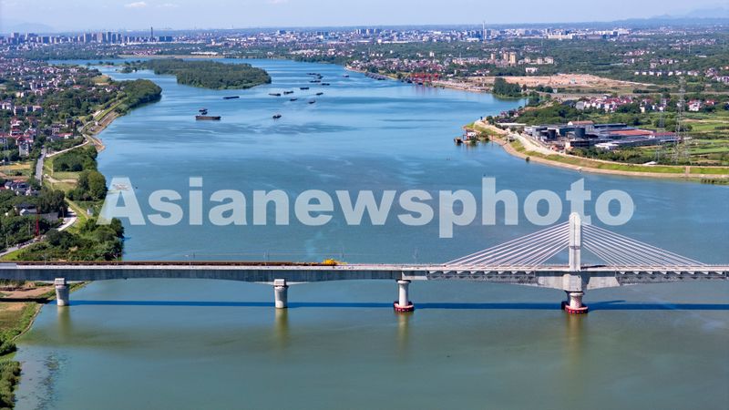 图片说明:2025年8月28日,俯瞰浙江省金华市金建高铁兰江特大桥桥面上,工程列车在忙于运输材料,轨道铺设工作正有序进行(无人机照片)。