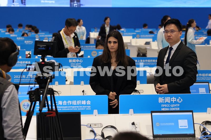 2025年8月30日,天津,媒体记者在2025年上海合作组织峰会新闻中心媒体公共工作区工作。