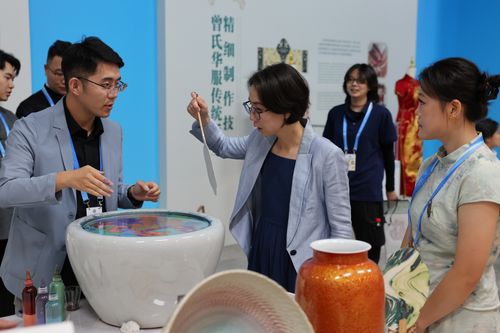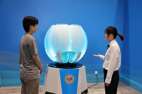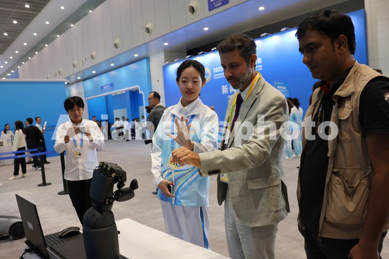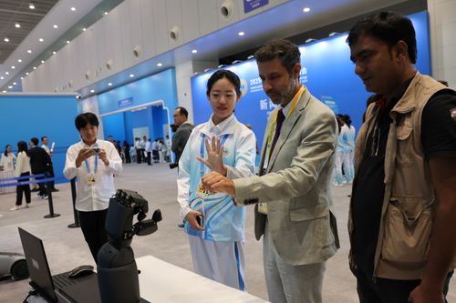 8月30日,媒体记者在新闻中心体验“多维触觉灵巧手”。