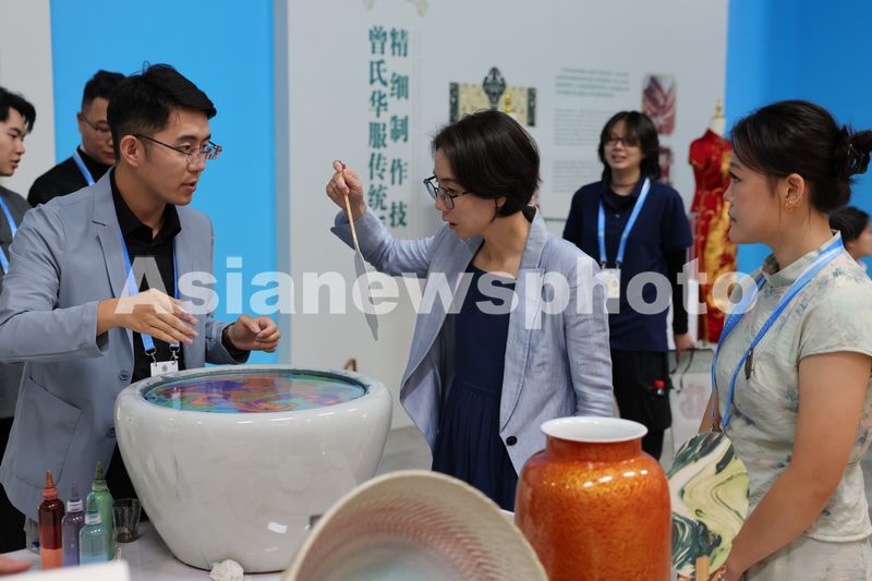 8月30日,媒体记者在新闻中心非遗互动展示区体验漂流漆技法。