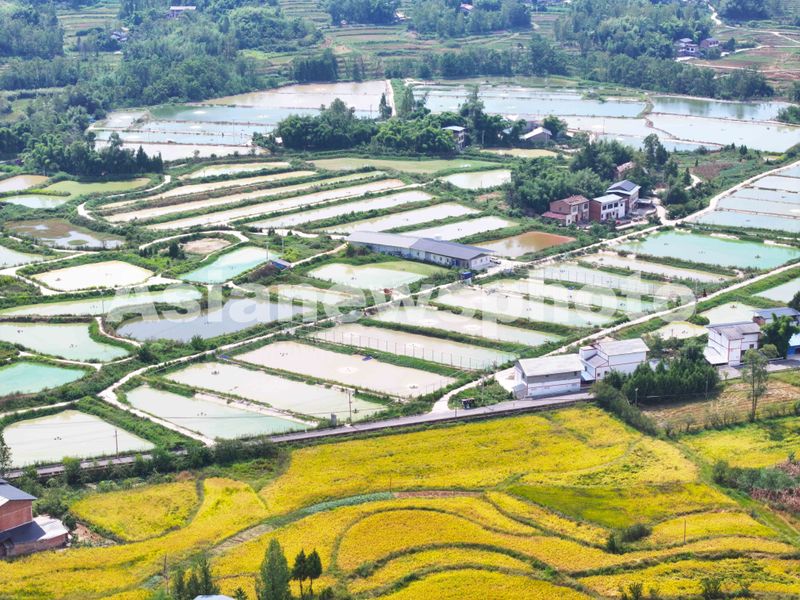 2025年9月2日,重庆市梁平区明达镇红八村,渔业园区内的鱼塘星罗棋布,水光潋滟,与稻田、村落、公路相映成景,勾勒出一幅美丽的秋日画卷。