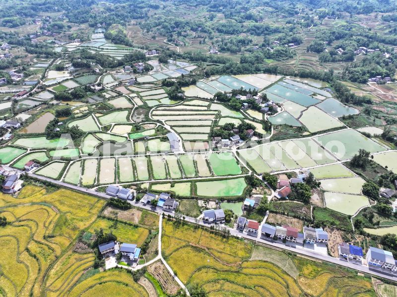 2025年9月2日,重庆市梁平区明达镇红八村,渔业园区内的鱼塘星罗棋布,水光潋滟,与稻田、村落、公路相映成景,勾勒出一幅美丽的秋日画卷。