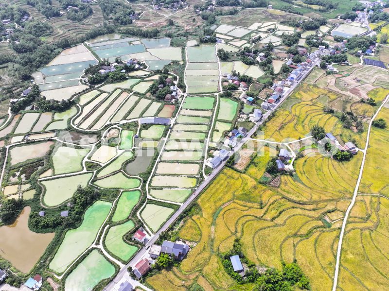 2025年9月2日,重庆市梁平区明达镇红八村,渔业园区内的鱼塘星罗棋布,水光潋滟,与稻田、村落、公路相映成景,勾勒出一幅美丽的秋日画卷。