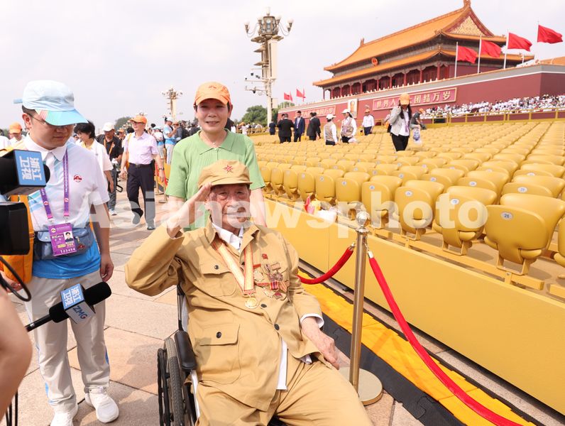 抗战老兵齐长友在观礼台前。