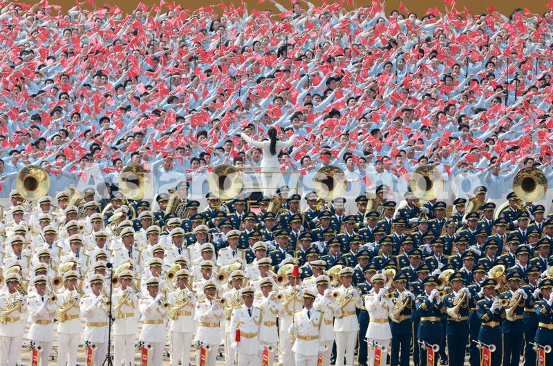 中国人民解放军联合军乐团和合唱团在奏唱乐曲。