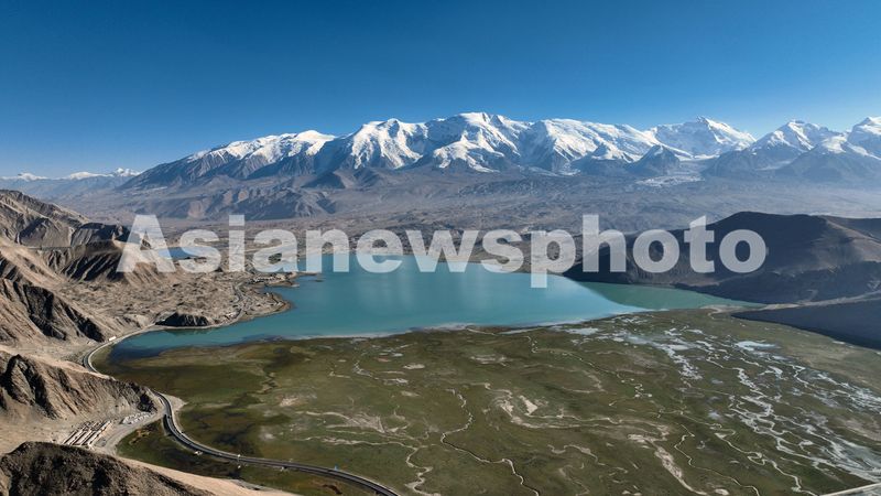 图片说明:2025年8月27日,空中俯瞰喀拉库勒湖澄澈的湖水中皎洁的冰山倒影其中,景色十分迷人。