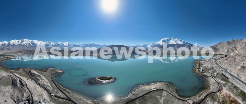 图片说明:2025年8月27日,空中俯瞰喀拉库勒湖澄澈的湖水中皎洁的冰山倒影其中,景色十分迷人。