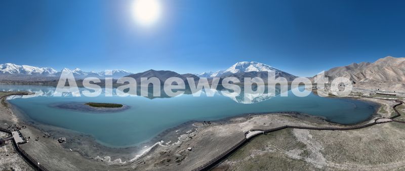 图片说明:2025年8月27日,空中俯瞰喀拉库勒湖澄澈的湖水中皎洁的冰山倒影其中,景色十分迷人。