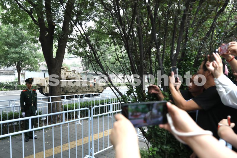2025年9月3日,北京东城区张自忠路,群众拍摄亮相阅兵式的武器装备。