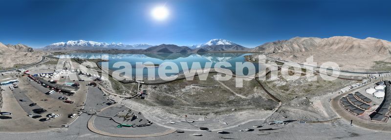 图片说明:2025年8月27日,空中俯瞰喀拉库勒湖澄澈的湖水中皎洁的冰山倒影其中,景色十分迷人。