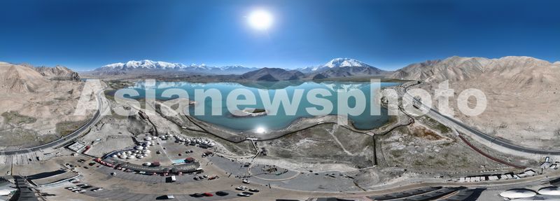 图片说明:2025年8月27日,空中俯瞰喀拉库勒湖澄澈的湖水中皎洁的冰山倒影其中,景色十分迷人。