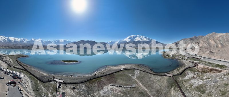 图片说明:2025年8月27日,空中俯瞰喀拉库勒湖澄澈的湖水中皎洁的冰山倒影其中,景色十分迷人。