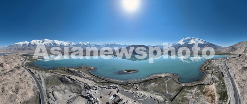 图片说明:2025年8月27日,空中俯瞰喀拉库勒湖澄澈的湖水中皎洁的冰山倒影其中,景色十分迷人。