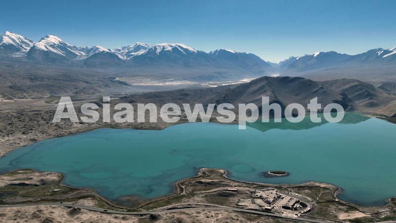 图片说明:2025年8月27日,空中俯瞰喀拉库勒湖澄澈的湖水中皎洁的冰山倒影其中,景色十分迷人。