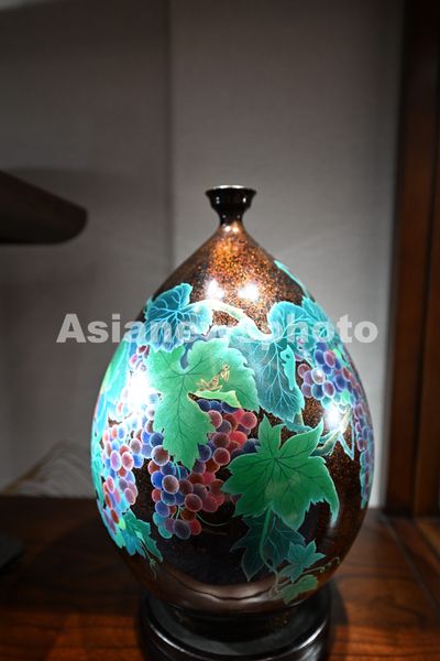 2025年9月4日,郑勇教授为上合峰会特地制作的陶胎漆器作品:“太平有象∙晕金缠枝葡萄无极纳福罐”。
