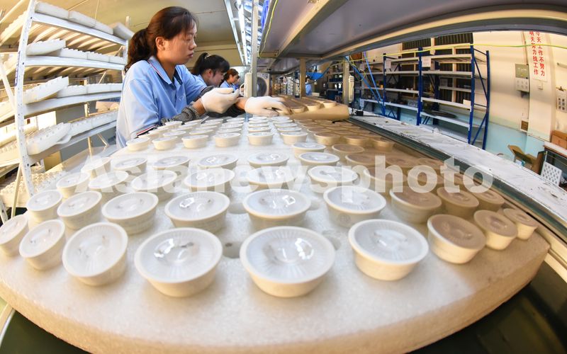 图片说明:2025年9月8日,江苏省连云港市海州区锦屏工业园,工人在生产线上赶制一批LED绿色节能照明灯具。